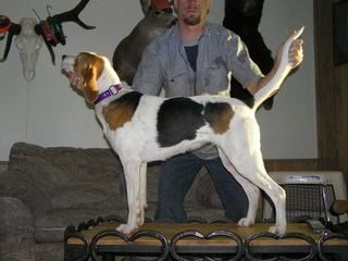 I've shown him 4 times. He's gotten two class wins. One judge loved him, but he wasn't behaving... Two of them put up dogs based on color. They thought having a white face was against the standard... I guess they never read. As long as it's a tri color, don't say where the colors gotta be! If you read the standard right, they don't even have to be Tri, it says that can be Tan and White or Balck and White too... Oh well. I think he's built right, and I'll keep showing him... I'm not afraid to show him on either wood, cause I'm proud of what I have. I take him to the Nite Hunt and put him on the bench the next morning. I also put him in the FT and WR's. He does good at times, but he thinks he's too smart for the fake stuff, and cheats if he can...