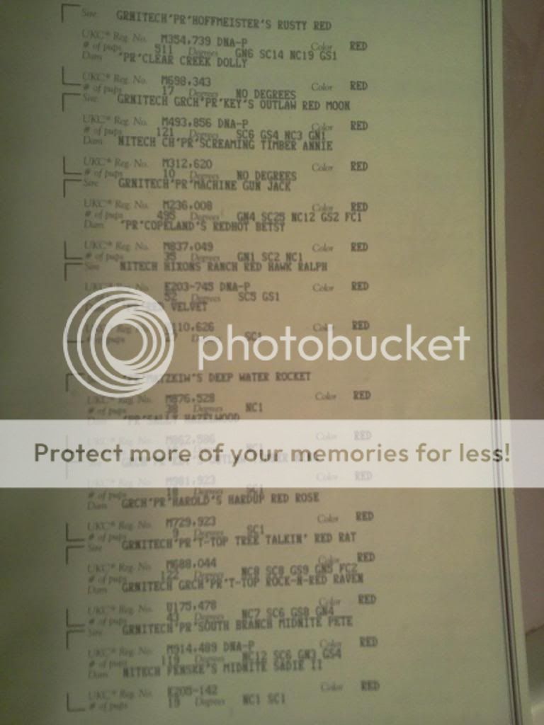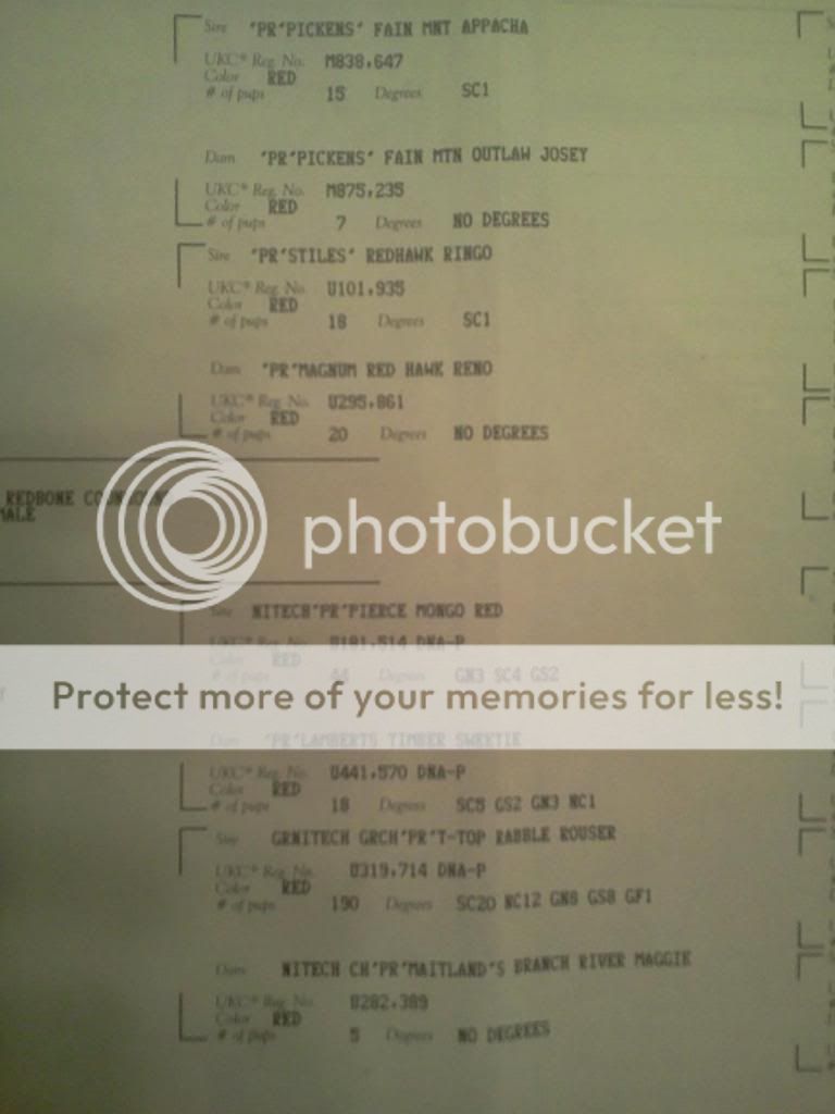 sire is smokey mnt slugger.a great hound used on bear here...he goes back to outlaw red moon, rusty red,and machine gun jack. His dam pigeon river dowhat dixie fine female big mouth out of pigeon river reddy freddy and a rabble rouser female going back to midnight pete.