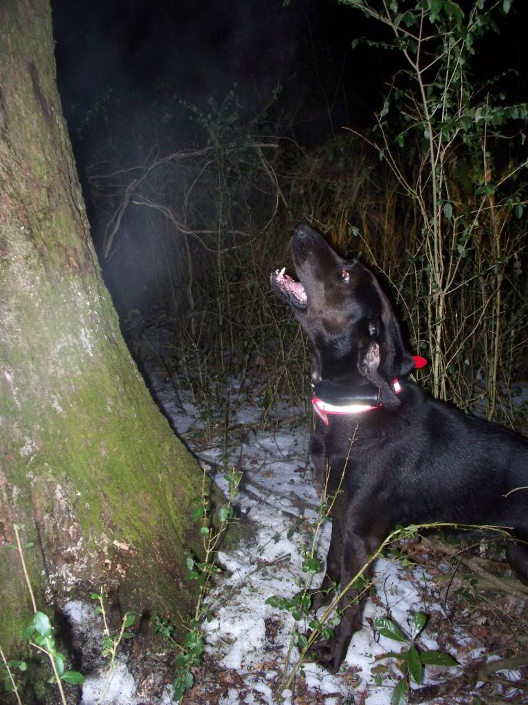 Now I know that when you read this, ya'll from the great white north are probably going to be smiling...maybe even laughing...but oh well. Down south we don't get snow every year, and even if we do it's not usually as much as we got this time (we got about 3.5"-4.5"). Even though most of it had melted by last night, what was left refroze when the sun went down. This was the first time that me and the dogs have hunted in the snow, and to be honest I was curious to see how they would do in it, because I've heard adding snow in the mix can trip them up some. We made 3 drops, 2 trees and the last one I ended up calling Dawn off because it was late (I had to get up to go to work today) and she was working a cold/bad track that I'm sure would have ended up at a den tree.