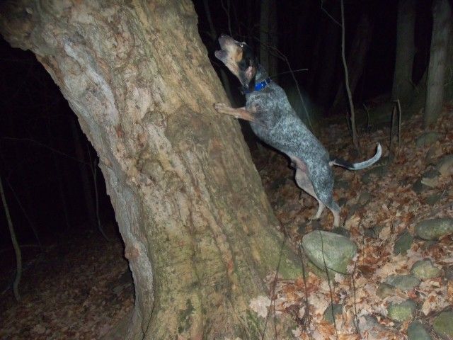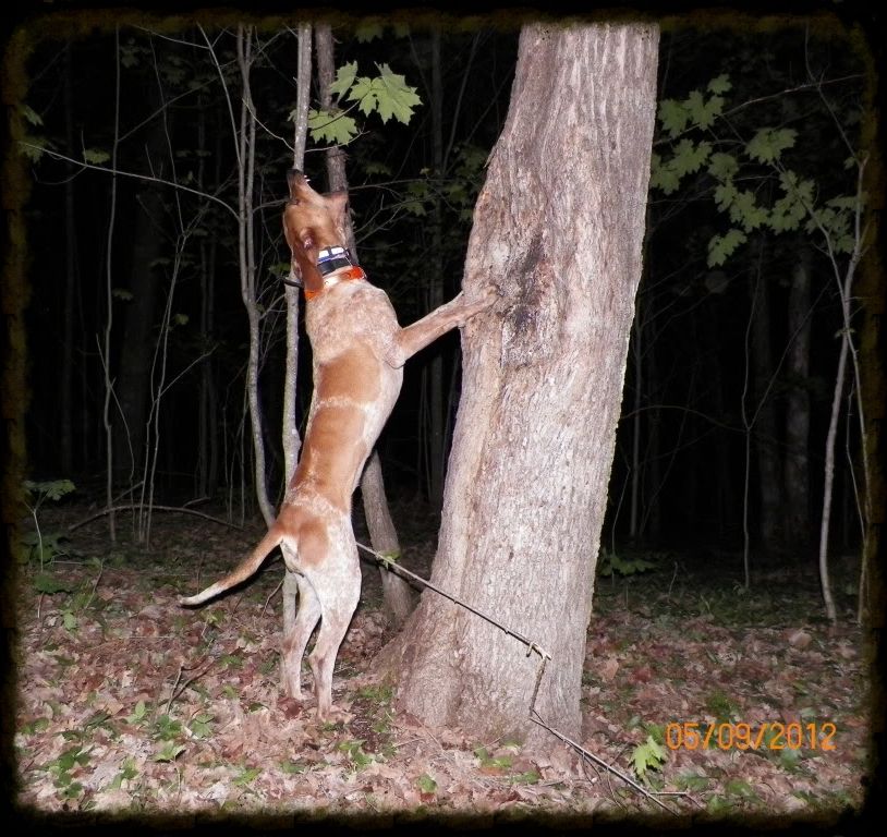 I have taken some real nice coon this year in the 18 to 22 pound range but we got our biggest tonite. Took my good friend Henry and his pup along. Bluspeck struck an old cold feeder track along a creek and grubbed it along aways and finally warmed it up. Coon tapped on two seperate trees before Blu settled on a big maple. The coon tried his best to hide in the grapevine tangle in the top but ole deadeye Henry spotted him rite off. The first shot sent him climbing down, and tho I did my best to squall him all the way down for Henrys pup he decided to stay about 20 feet up. Head shot tumbled him out but off he went. We gave him a head start and turned Henry's pup loose she opened nice on the track. We cut Blu in for support and they treed in another large maple about 100 yrds away. Course I reach for the camera and I had left it home. Packed the ole boar out and took this picture when I got home. Bluspeck is a 75 lb hound and the coon tipped the scales at 24 1/2 lbs. My biggest coon ever was back in 1973 weighed just a bit over 29 lbs. I have killed several in the 23 to 25 lb range over the years. I would love to hunt Wisconsin, Maine or Canada wher you can get one in the 30 to 40 lb. range!