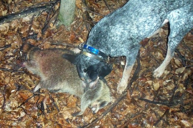 Wasnt able to weigh this boar, Here is my partner Paul holding Bluspeck and Mainstreet Jacki with a coon well over 20 lbs. Been getting long runs and many dens.
