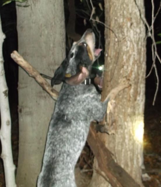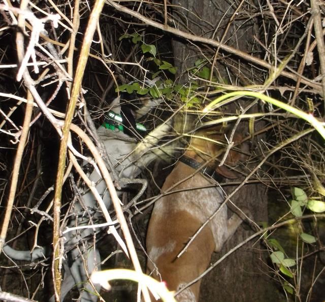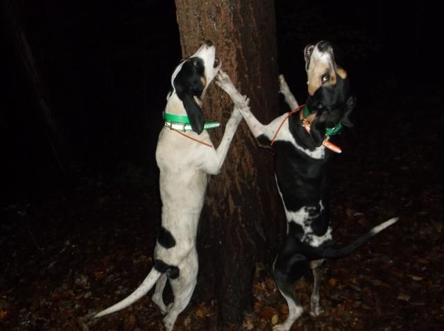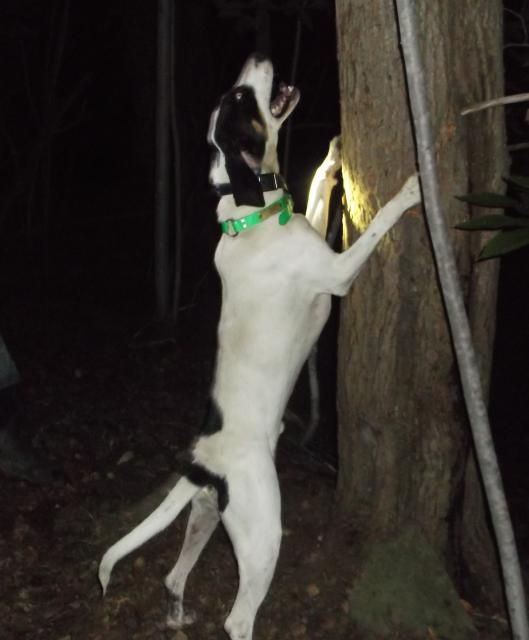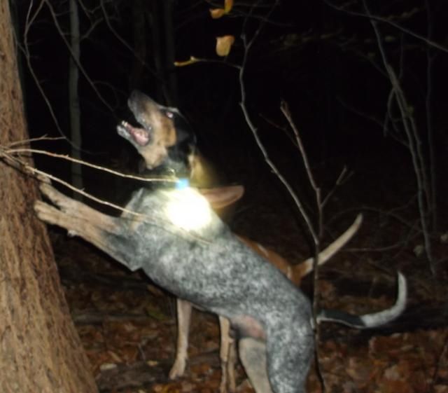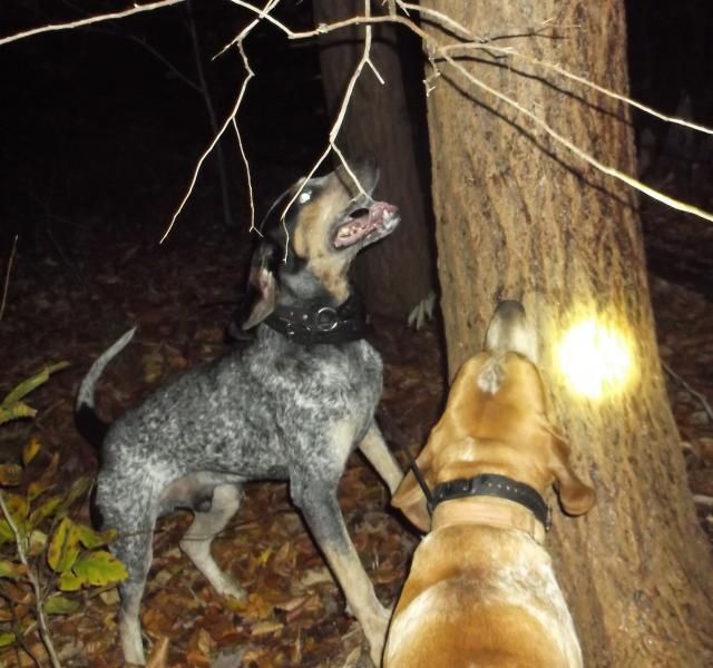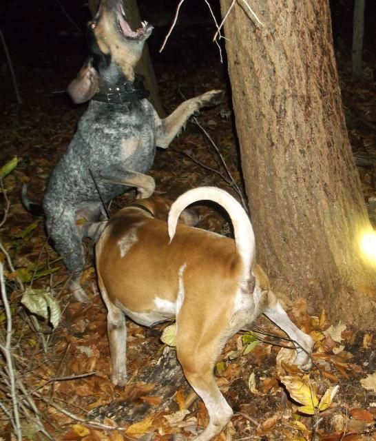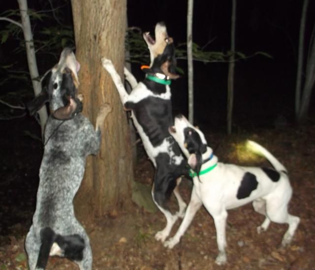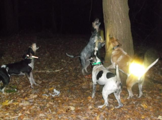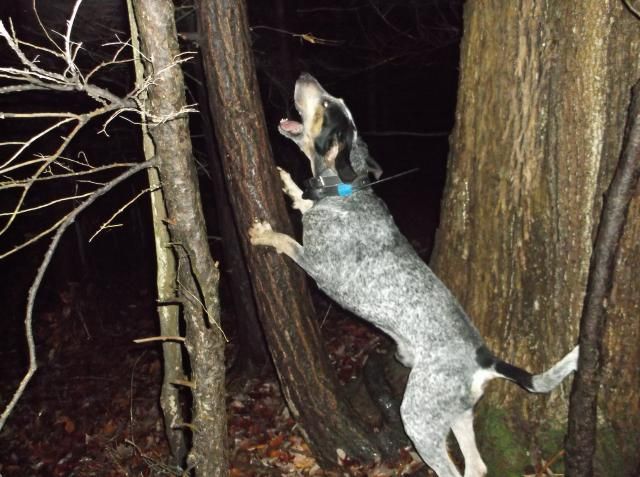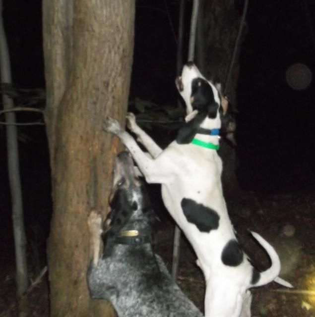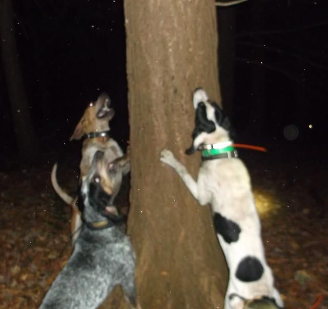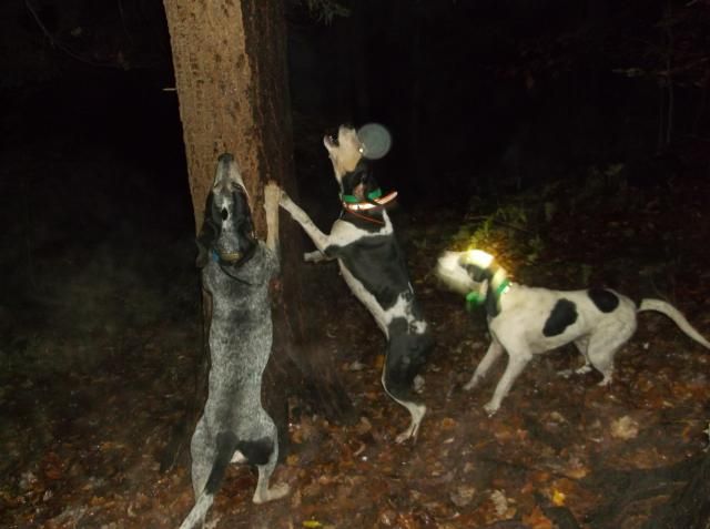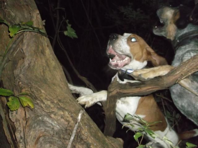 Cut again dogs treed up further in a big ash with grapevines everywhere coon was not there. Third cut ended up in the woods on a big home tree. 4rth drop was a nice long run and ended in a big hemlock, try as we might couldn't get coon to look!