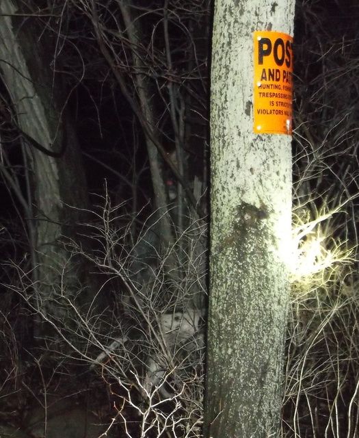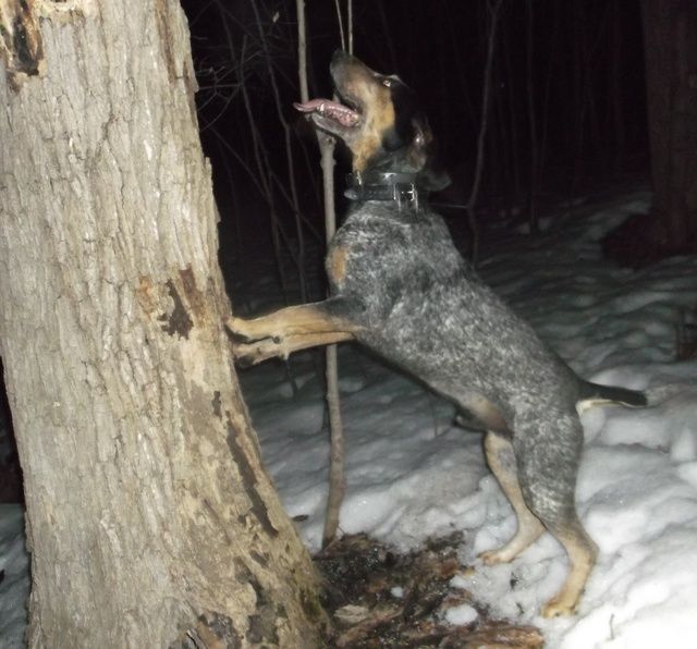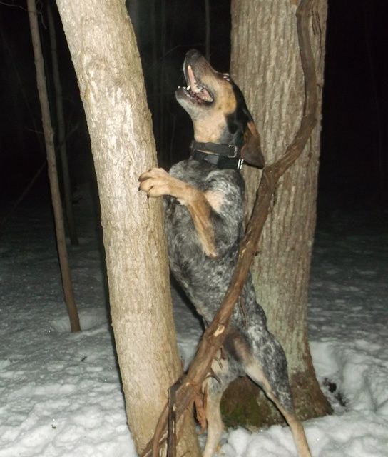 The first drop Blu struck and I told Paul that Blu was smart and doing exactly what I ask, he said what do you mean? I said when I cut him in this thick stuff I whispered to him to stay on the logging trail and that's just what he is doing! LOL We got treed in a big ole poplar and saw the coon. Second drop Blu went a good 600 yrds came treed in a hedgerow, when we got there I said Yep Paul he is a smart dog! I told him this time if he got close to posted land tree him real close to the boundary so we can sneak in, and that's just what he did!! Hey the spring peepers were out for the first time last night, I think spring is coming!!