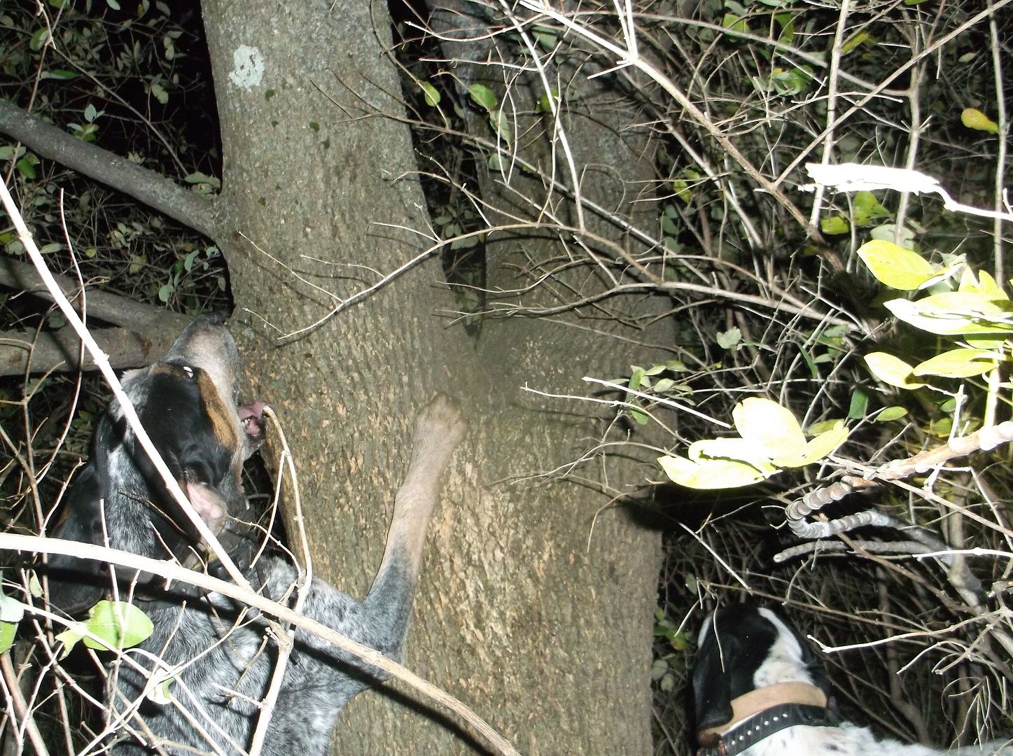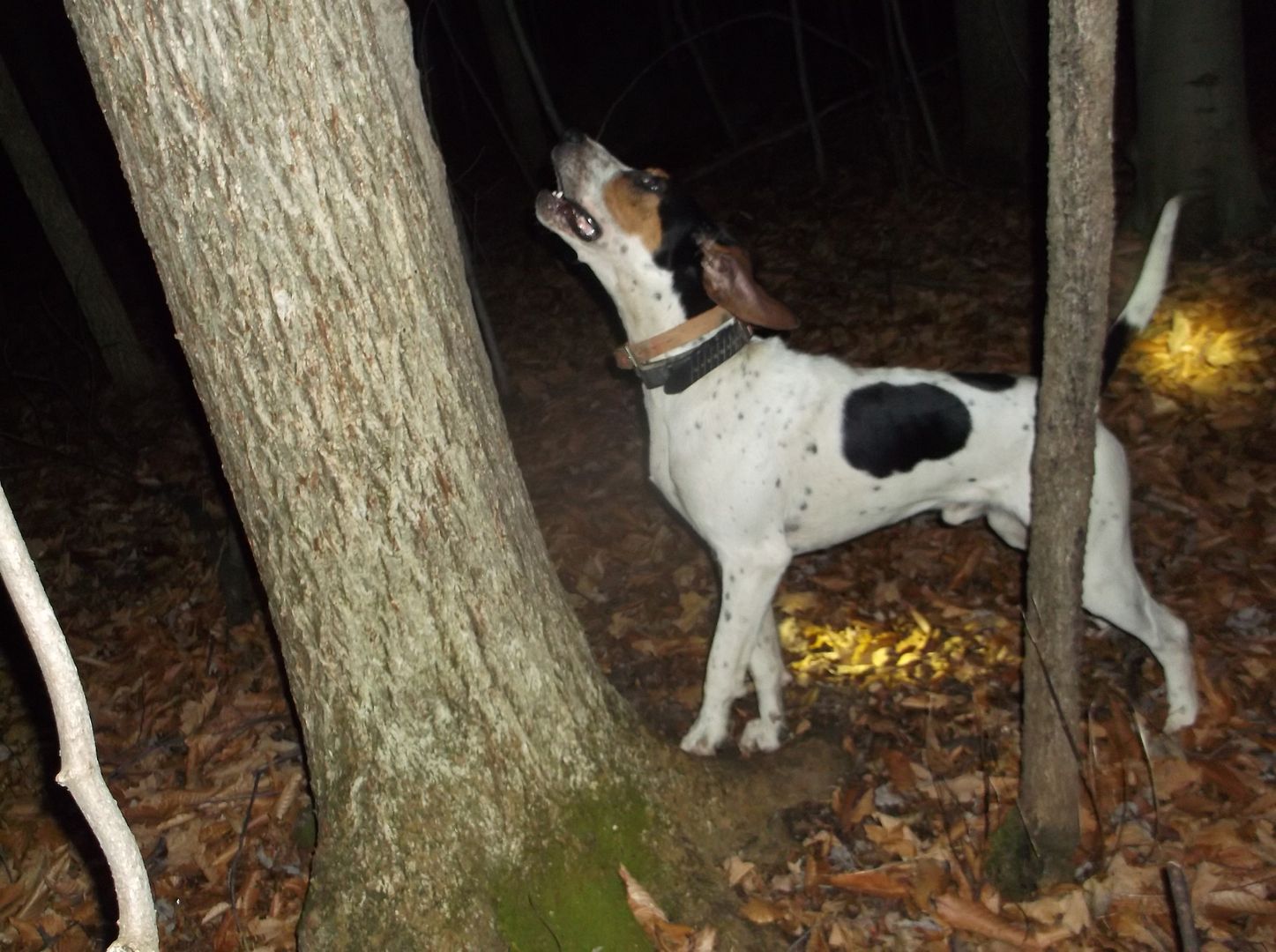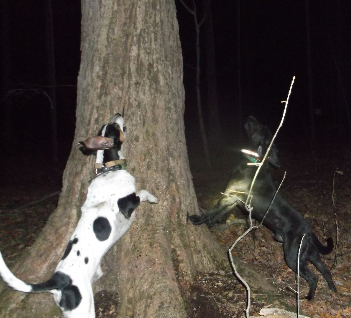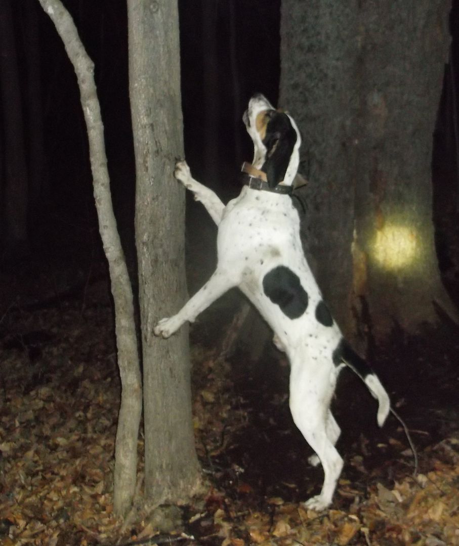 Bluspeck struck close to 600 yrds above me again, as I walked in his direction I heard the steady tree chop way up in the distance. He had the still night ringing it was awesome to hear him tree so hard on such a clear beautiful night! Got to him and he was treed solid on a leaning tree.