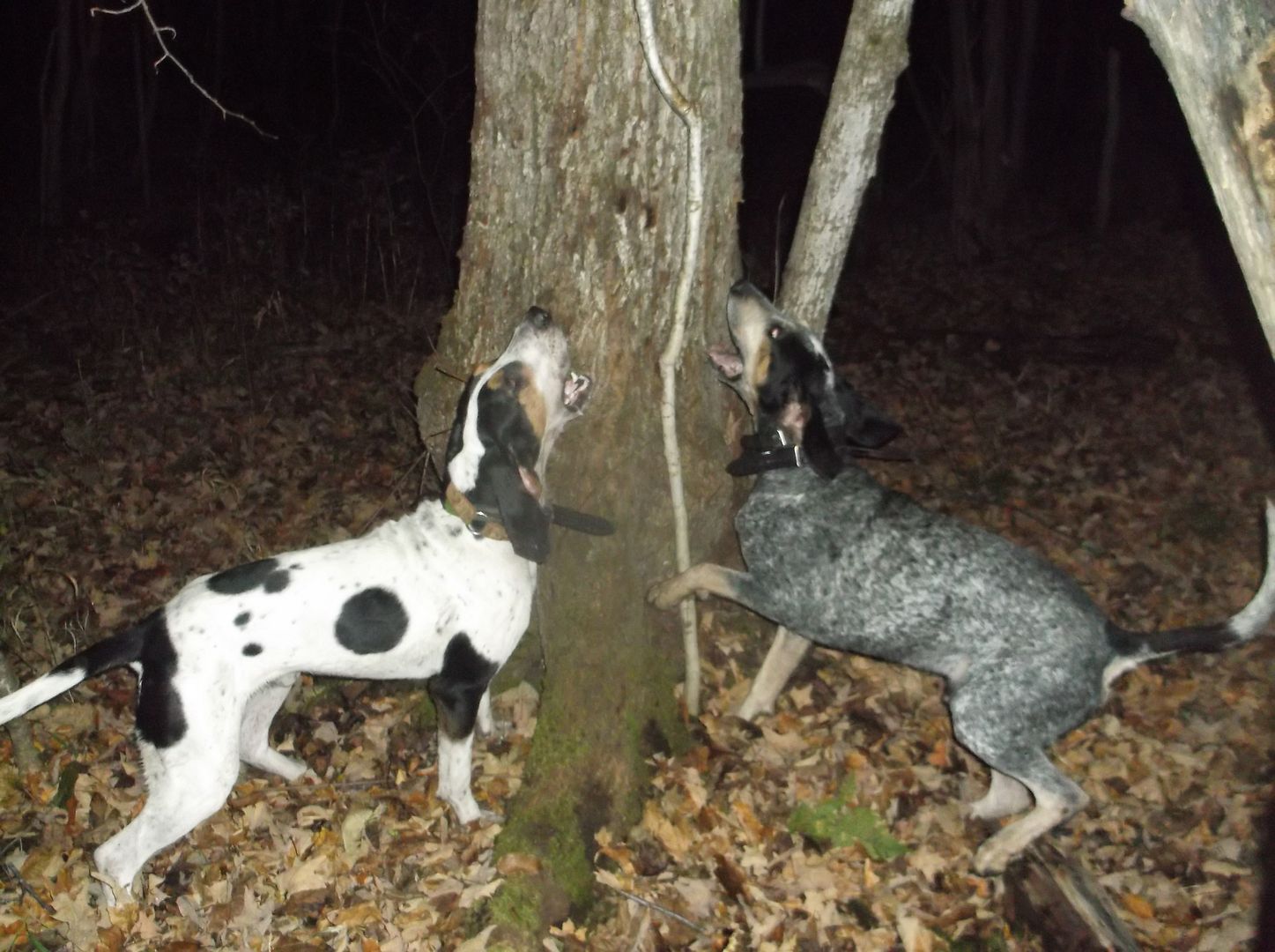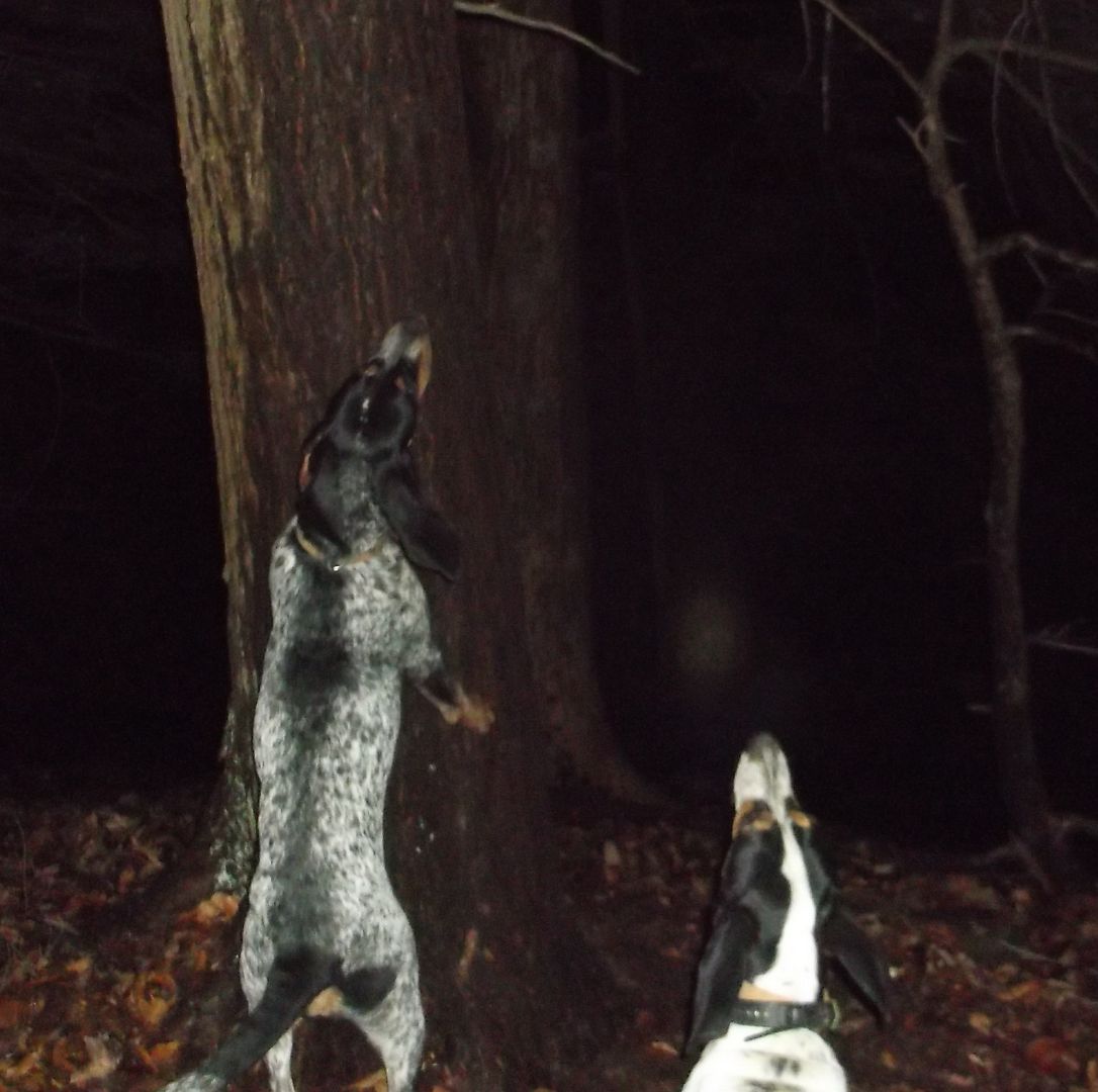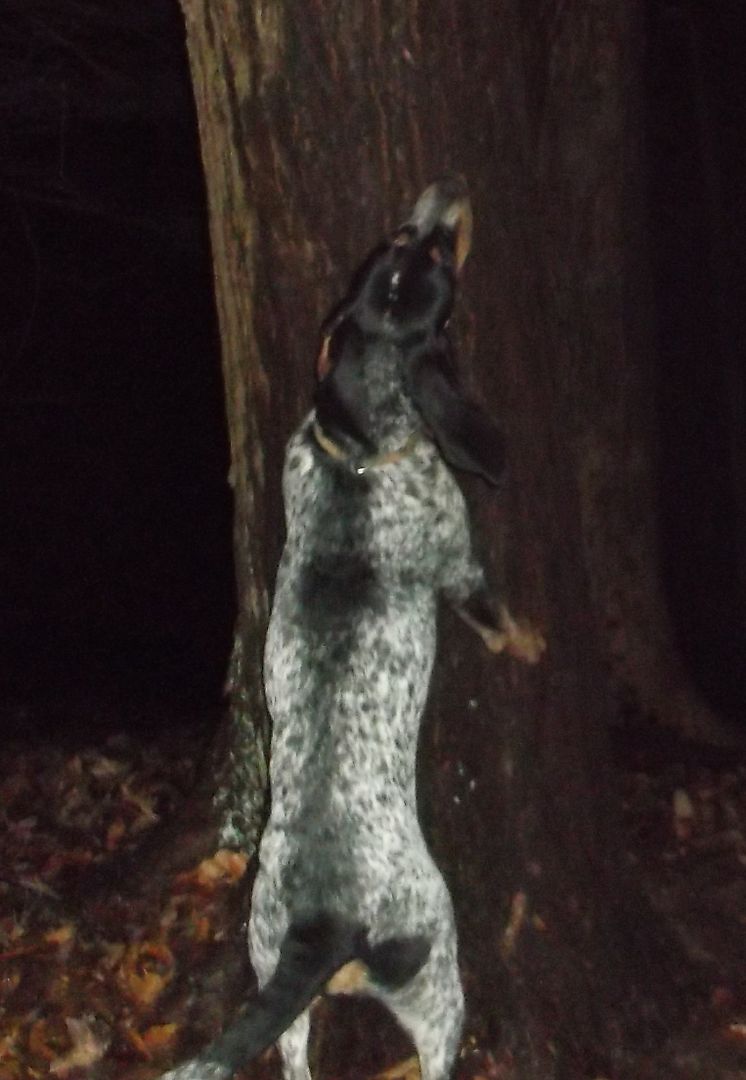 I must say in all my years of starting young dogs I have NEVER EVER had a pup open and tree hard on it's first trip to the woods. Some show interest and go with the older dogs and maybe bark a time or two at the tree out of excitement but never like this little Blubelle showed me on this night!