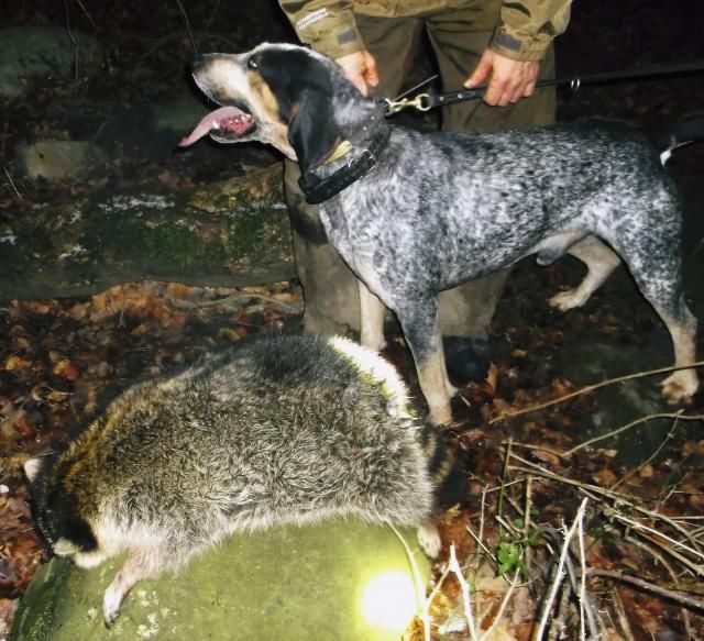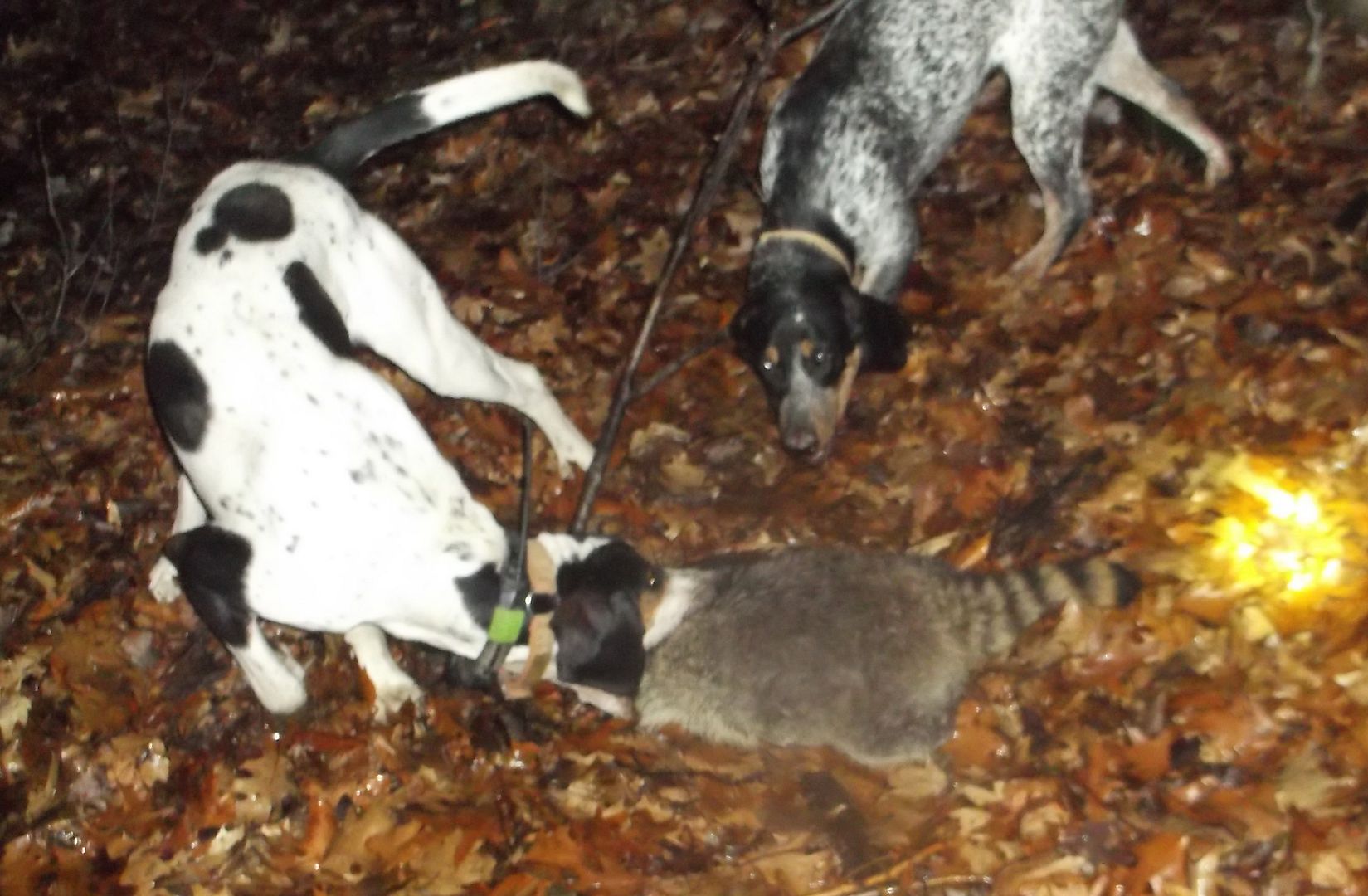 We walk hunted for quite awhile before Samson struck again in a big hemlock woods below Burleys pond. He worked an old feeder track then located on a big hemlock at the edge of a ravine, little Blubelle came in smelled the tree and backed Samson. It was hard seeing the top of the tree as close as the other trees were I shined but finally decided to leash dogs and head home figuring it was a great night! Walked about 500 yrds towards home when Samson smelled coon and came unraveled so I cut both dogs, Samson went about 40 yrds struck a hot track and with Belle opening they came treed close by. Walking in I saw eyes in the big hemlock spaced far aprt, the crack of the Ruger brought the big boar down and it rolled down the steep ravine side and into the creek. Dogs and I slid down and both excitedly wooled the big ole boar. Man what a night for my young dogs! I always say with young dogs you just keep taking them till you encounter the right conditions and situations and try to leave on a good note!! Young dogs I always carry the coon with me to let them know I want it and how happy I am with it. I carried the coon home with Belle just a wagging her tail and me telling her what a great job she did!!! Her brother Speck is next!!